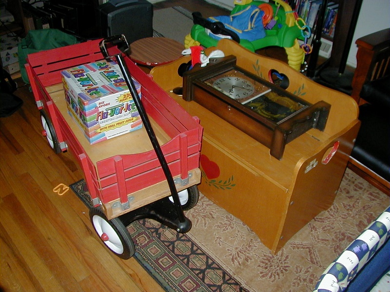 Here's some stuff we got Saturday. The wagon is from Francine. The clock and toy chest/bench was from a citywide yard sale.