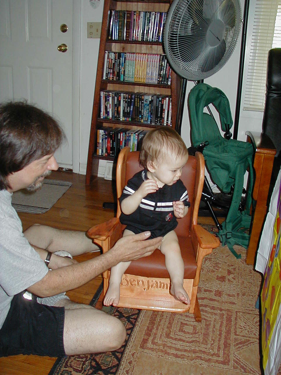 Ben and his fantastic new chair. Grandpa Sanders crafted this amazing pint sized rocker. He even did the upholstery work!