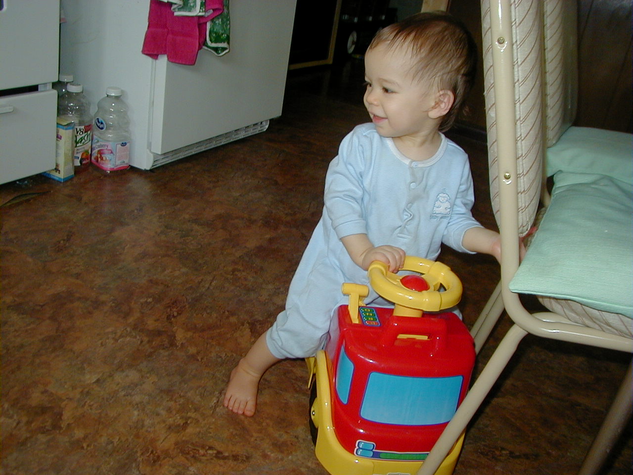 He rides it pretty well. He hasn't learned to push it yet, and he is still learning how to dismount. He has to hold onto something to get off.