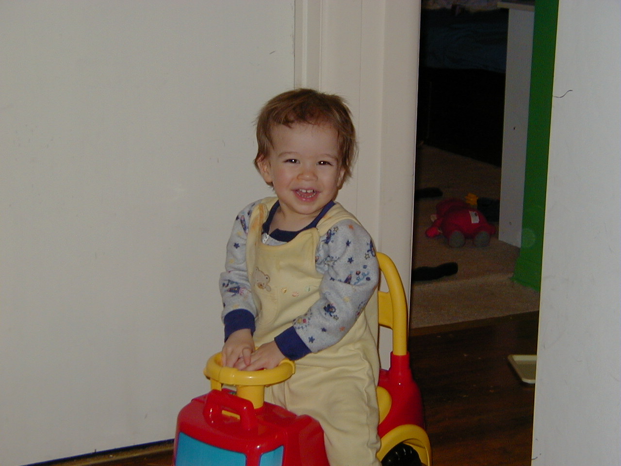 Ben right before bed time, riding his fire truck and playing with Elmo.