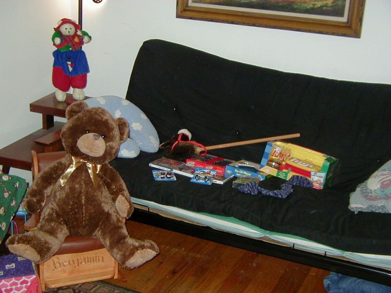 Some of his other gifts. A big teddy, hobby horse, about a dozen cars, a McDonald's cash register (Apple Pie!), a handmade scarf, a pretend CD player, and several videos. Thanks everyone! He loves them all :)