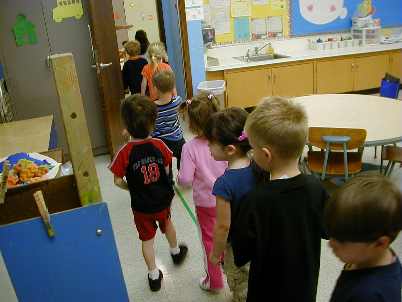 Next the children line up to go to the main activity room. There is also a gym but they didn't visit there today so I didn't get any pictures. They pass through the bathroom to get to the other room.
