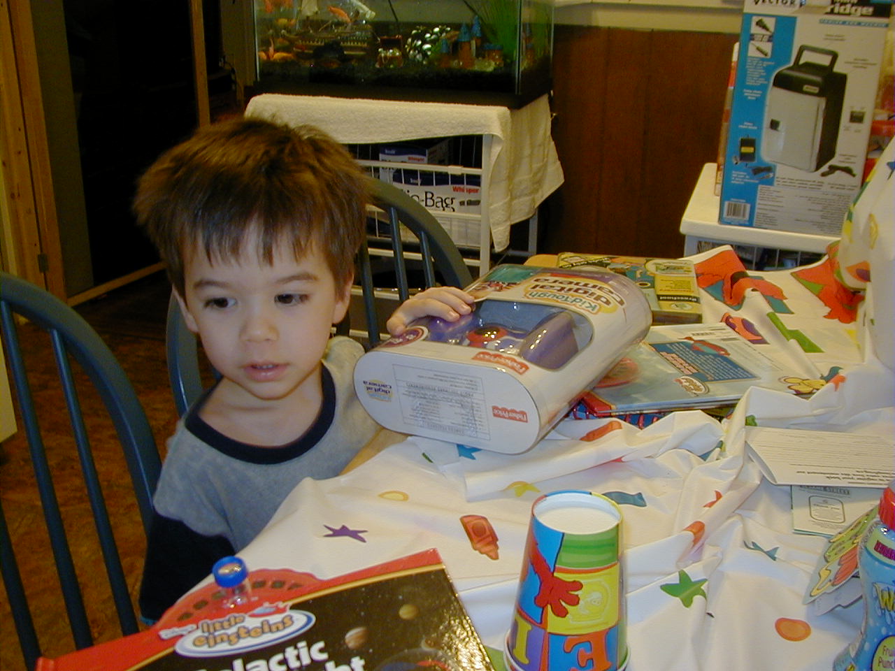 He also got a Fisher Price digital camera, which he enjoys quite a bit! Though really he just likes the sounds it makes whenever you perform an action.