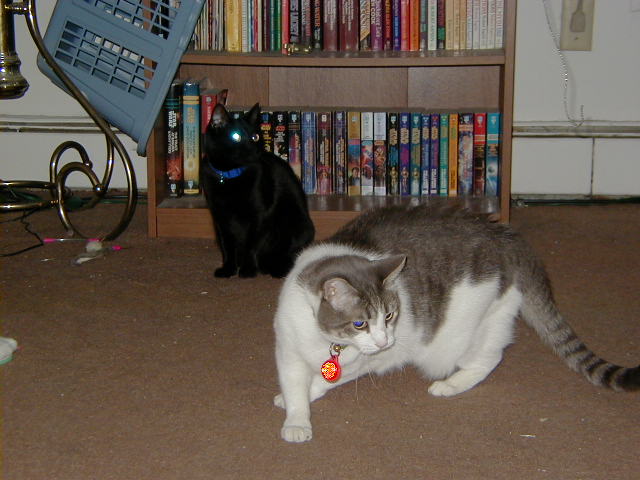 Here is Fritzy Glow Eye on the prowl in our living room, with Squeakers Sparkle Eye standing guard behind her!