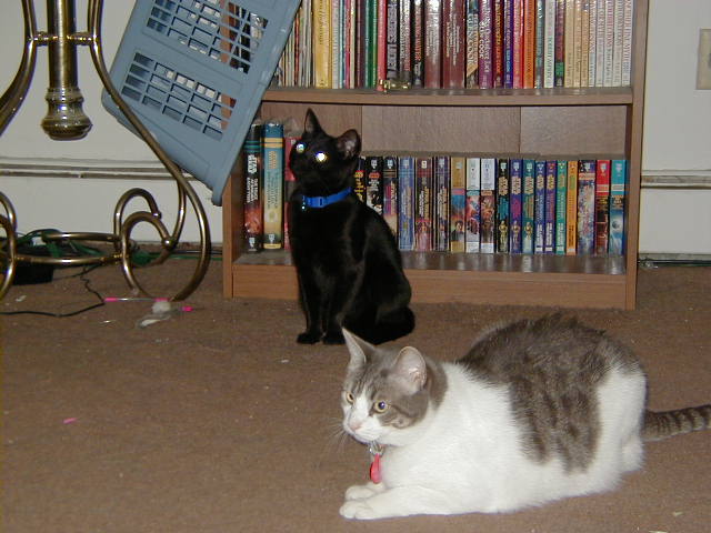 Now that the hunt is over with, Fritzy returns to her position on the floor to rest. While Squeakers (ever diligent) sits behind in case of another attack!!