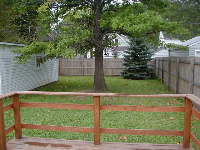 The deck overlooks the yard and has a nice tree. I think I see acorns! =)