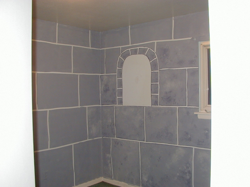 First Dad did a solid coat across all the walls, then removed the tape. Now he is going back and making the blocks look like stone.
