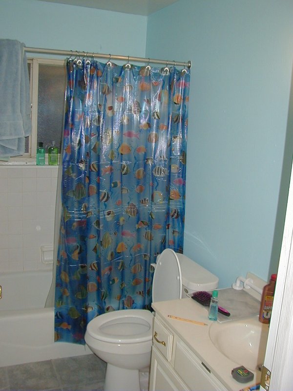 Here is the bathroom repainted, with new tile, new toilet and new shower curtain.