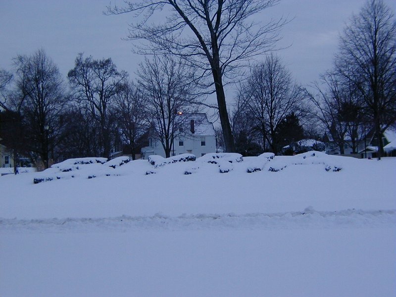 A little hard to make out, but these are bushes that spell Elyria. At Christmas they were covered in lights, today they are almost fully covered in snow. haha